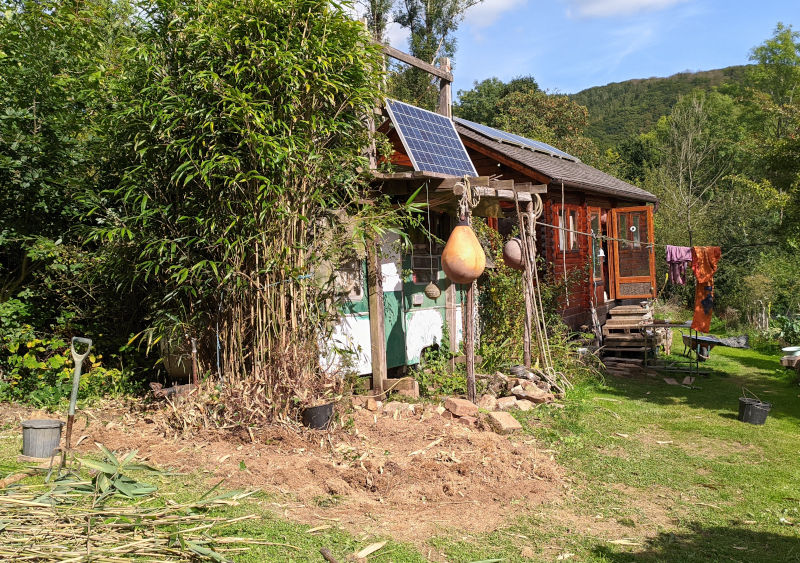 April 25th 2020 I started to cut back the bamboo at the end of the caravan by the workshop. Ostensibly to give more light to, what I think is, a quince sapling of a few years. I had also found the bamboo impinging on access bewteen the caravan and workshop, so I ended up cutting it all down.