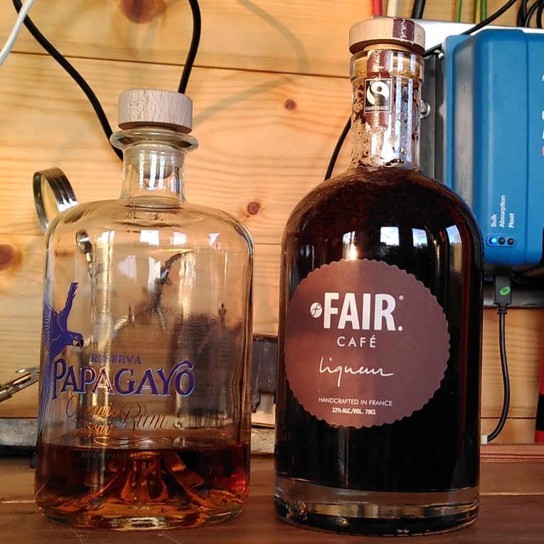 Half a bag of coffee, so maybe 125gMost of a bottle rum, so maybe 575ml