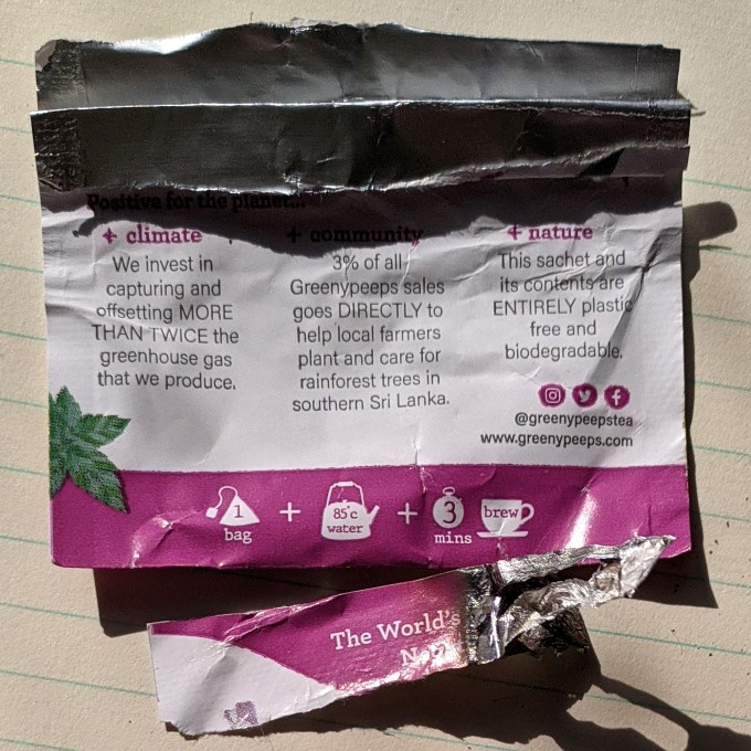 I had a free sample of Greeny Peeps tea with the Essential catalogue. Intrigued I read the packaging which says:-